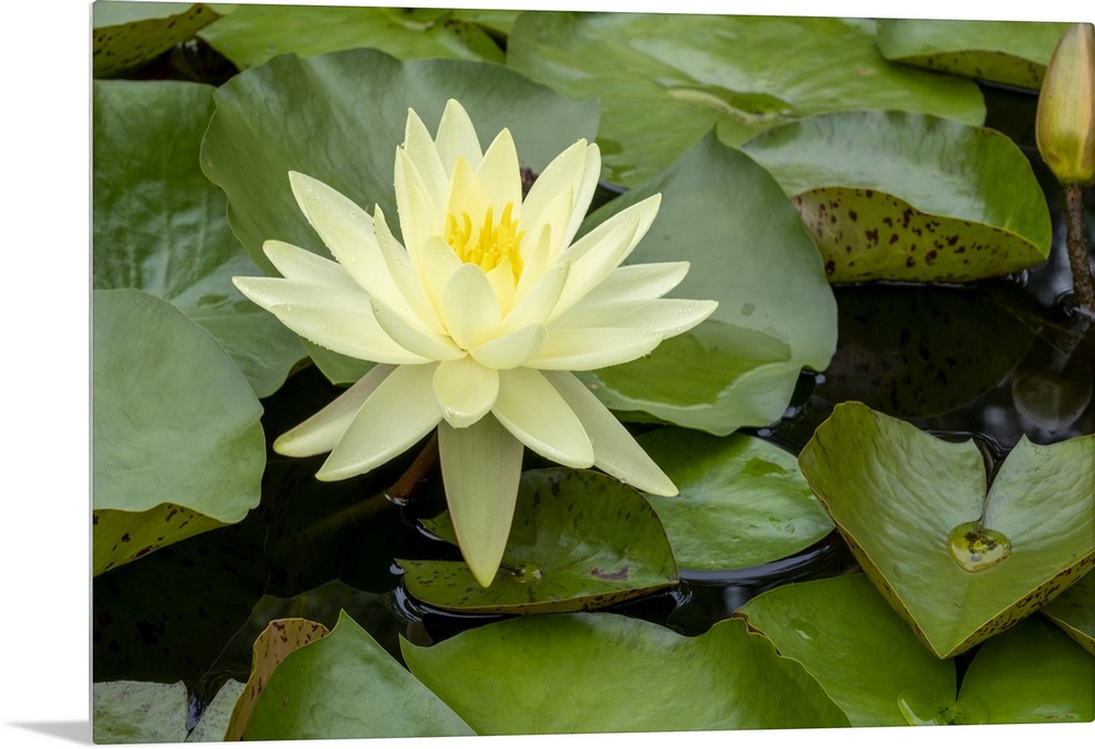 <p>Boothbay Harbor, Maine, USA. Coastal Maine Botanical Gardens. Yellow Water Lily (Nymphea Mexicana). United States, Maine.</p>
