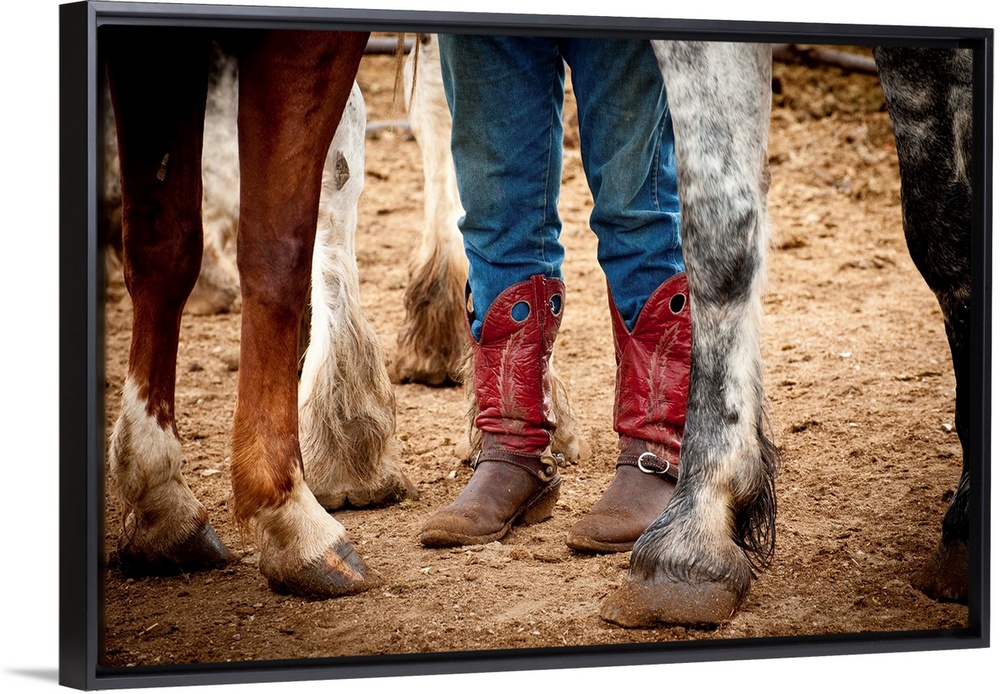 <p>Photograph of red cowboy boots and horse hooves.</p>