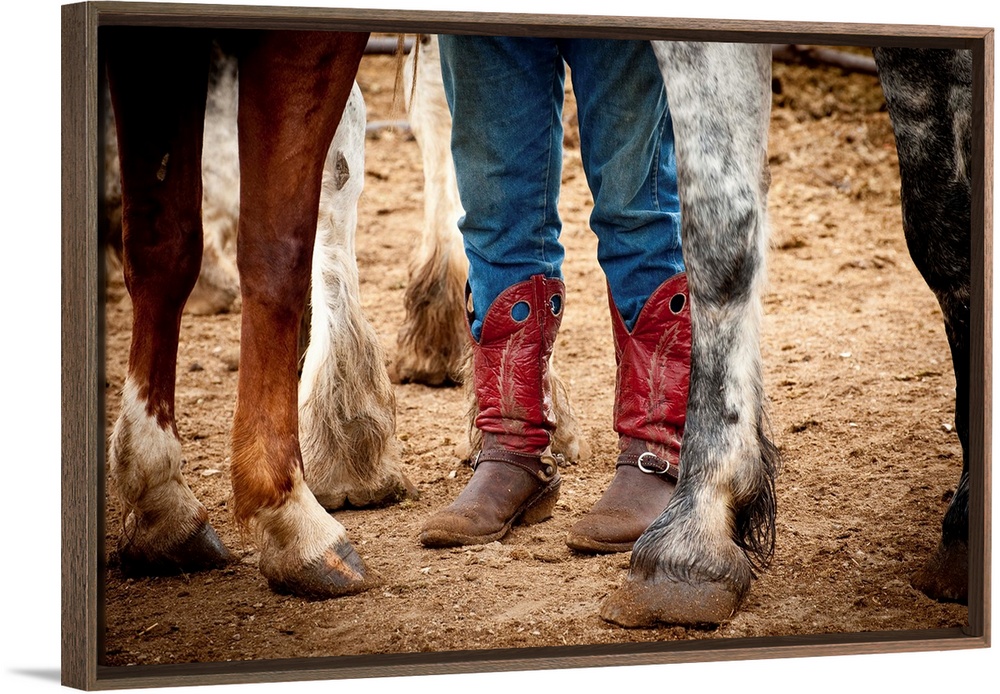 <p>Photograph of red cowboy boots and horse hooves.</p>