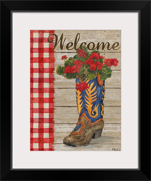 <p>Western style decor with a cowboy boot filled with small red flowers on a wood background with a red and white checkered pattern on the side and "Welcome" written at the top.</p>