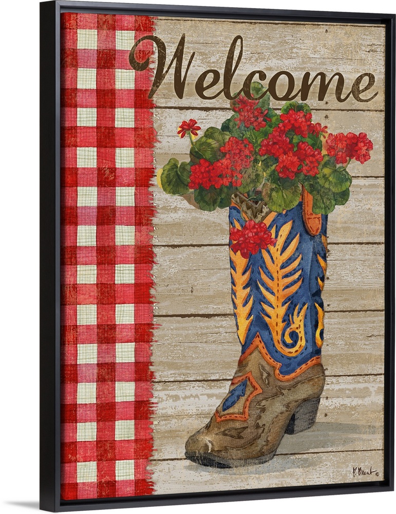<p>Western style decor with a cowboy boot filled with small red flowers on a wood background with a red and white checkered pattern on the side and "Welcome" written at the top.</p>