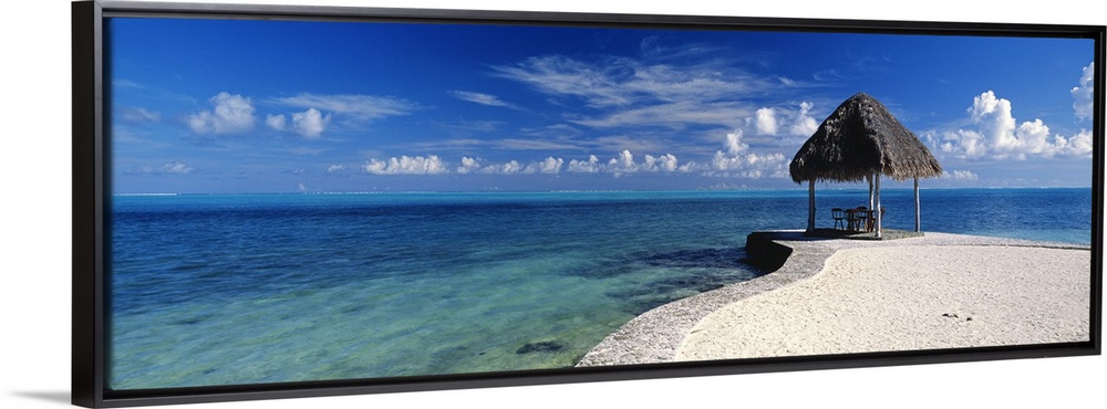 <p>Panoramic view of a small straw hut sits on the beach that protrudes out into the clear blue ocean.</p>
