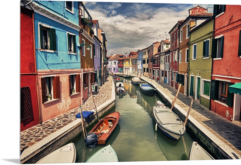 <p>This landscape photograph shows a narrow canal lined with vividly colorful houses.</p>