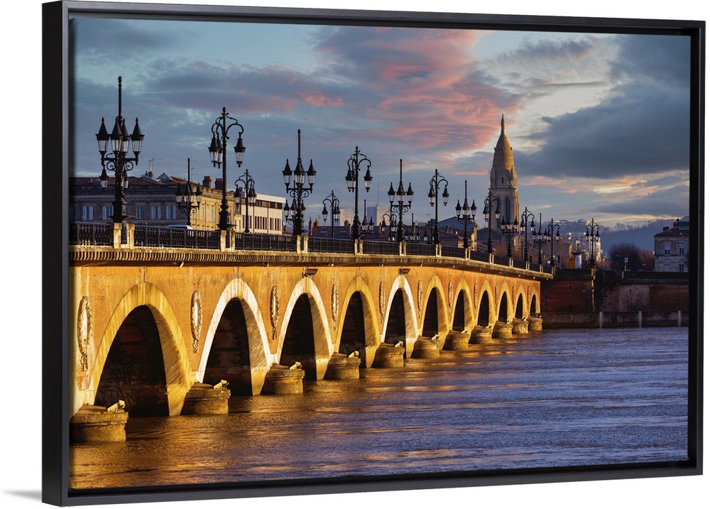 <p>Bordeaux, Gironde Department, Aquitaine, France. Pont de Pierre or the Stone Bridge, built between 1819 and 1822. The spire belongs to the church of oglise Sainte-Marie-de-la-Bastide. The historic centre of Bordeaux is a UNESCO World Heritage Site.</p>