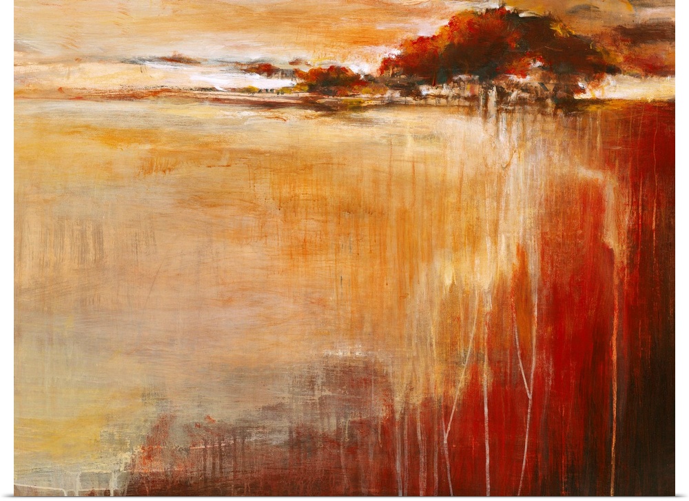 <p>Huge contemporary art uses a lot of darker warm tones to construct a thin landscape with a few scattered trees cutting through a large section of open water. Artist uses an effect that makes some of the ink appear as though it is running down the face of the original canvas.</p>