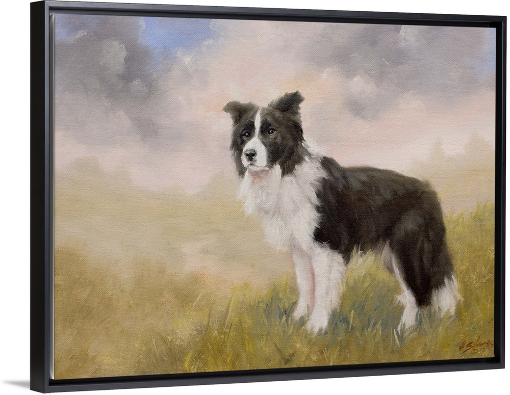 <p>Contemporary painting of a black and white shepherd dog.</p>