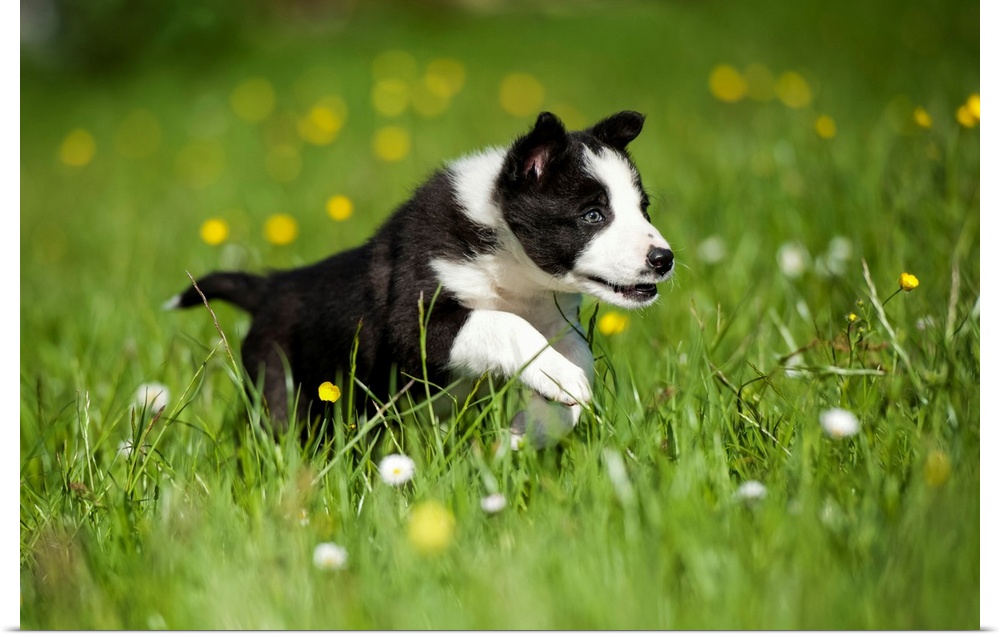 <p>Border collie puppy running in a meadow; Cumbria, England.</p>
