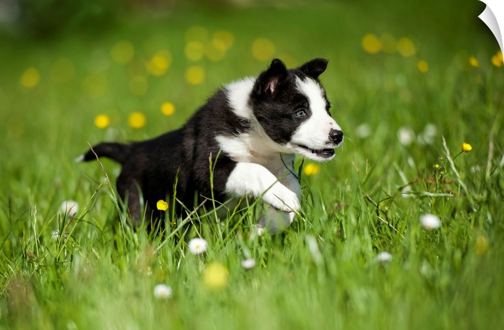 <p>Border collie puppy running in a meadow; Cumbria, England.</p>
