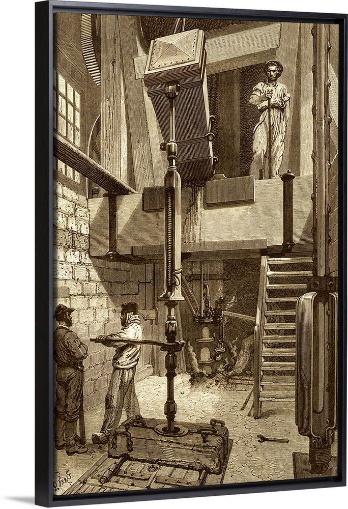 <p>Boring a hole. Historical artwork of workers using a steam-powered boring device to dig a deep hole. One worker is turning the shaft between each stroke so that the cutting device hits all parts of the rock face. Such devices were often used to find coal seams for subsequent mining. The bottom of the bore-hole is kept filled with water so that the debris removed by the percussion of the chisel can be lifted by a pump. Taken from Mines and Miners, L. Simonin, 1868.</p>