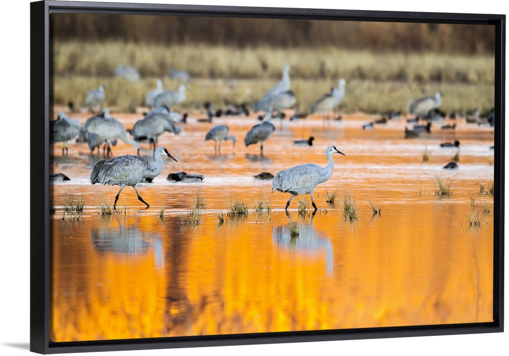 <p>USA, North America, New Mexico. Bosque Del Apache National Wildlife Refuge, Sandhill Cranes In Water At Sunrise.</p>
