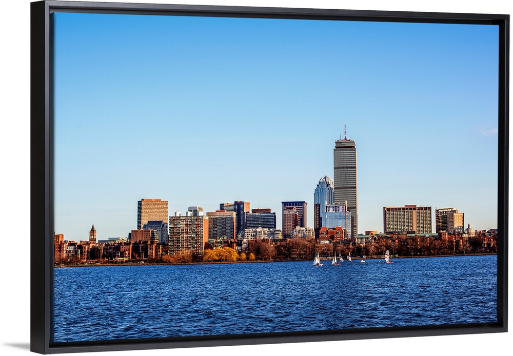 <p>View of Boston city skyline and Prudential Tower with sailboats on the Charles River.</p>