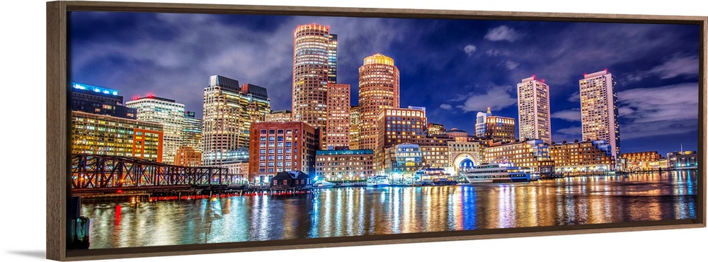<p>Panoramic view of the Boston City skyline at night, with lights reflected in the water.</p>