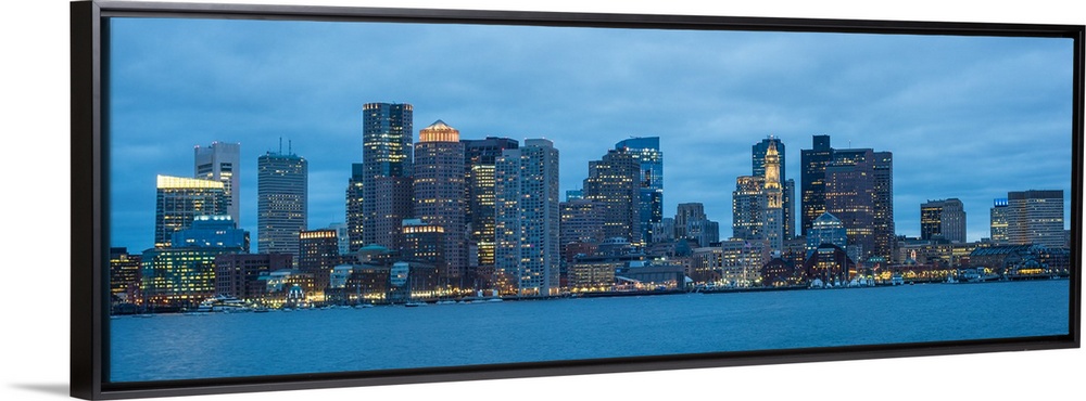 <p>Panoramic view of the Boston City skyline at night, with a cloudy sky overhead.</p>