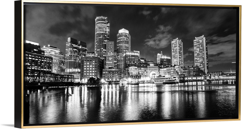 <p>Panoramic view of the Boston City skyline at night, with lights reflected in the water.</p>