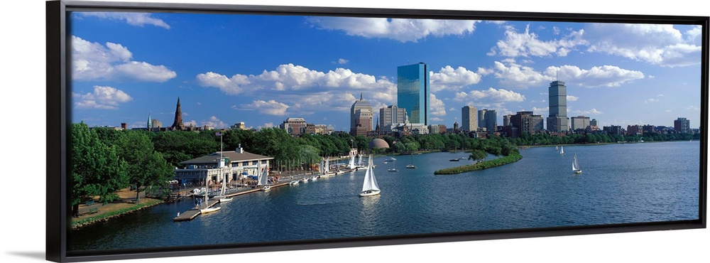 <p>Panoramic photograph of skyline and waterfront under a cloudy sky, with sailboats in the water.</p>