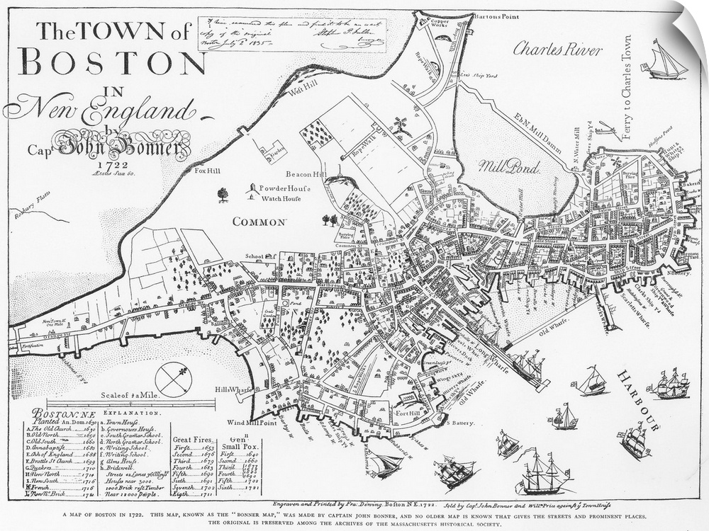 <p>Boston Map, 1722. Engraved Facsimile By George G. Smith, 1835, Of A Map Of Boston, Massachusetts, By John Bonner, First Printed In 1722, Showing Changes In the City's Topography through 1769.</p>