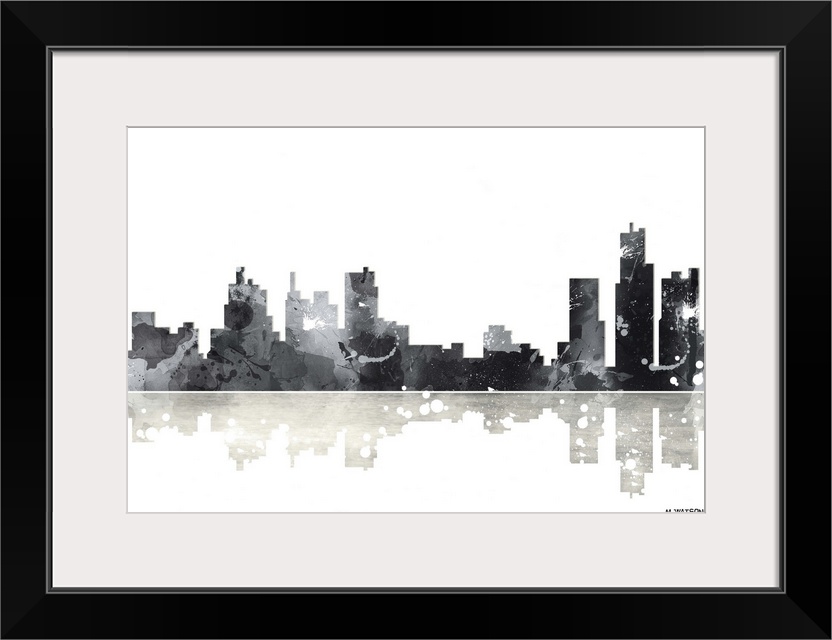 <p>Contemporary black and white watercolor skyline casting a mirror-like reflection below.</p>
