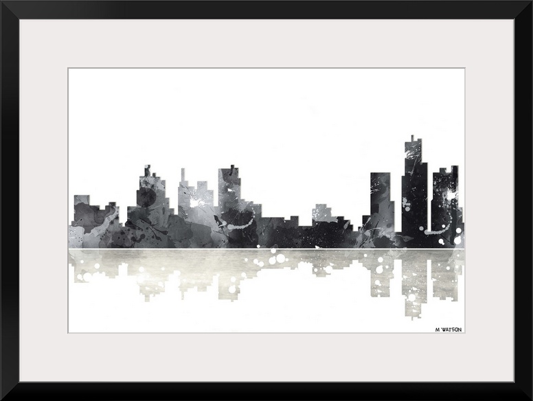 <p>Contemporary black and white watercolor skyline casting a mirror-like reflection below.</p>