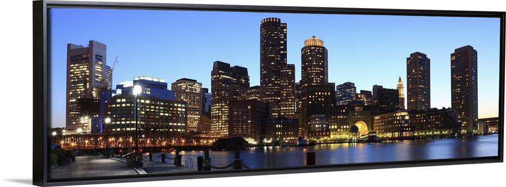 <p>Skyline of downtown Boston's financial district from inner Boston Harbor, at dusk</p>
