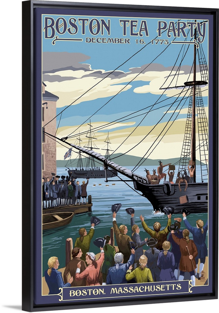 <p>Retro stylized art poster of a ship pulling into a harbor, with crowds of people watching.</p>