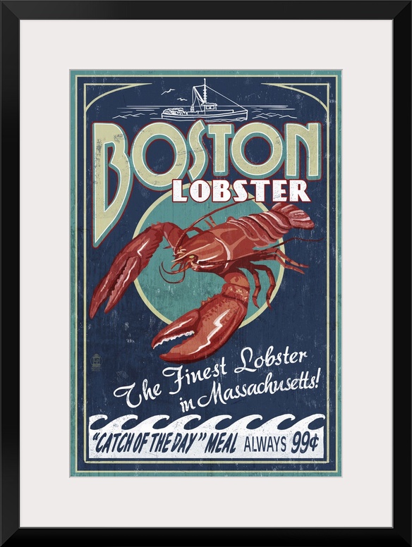 <p>Retro stylized art poster of a vintage seafood market sign displaying a lobster</p>