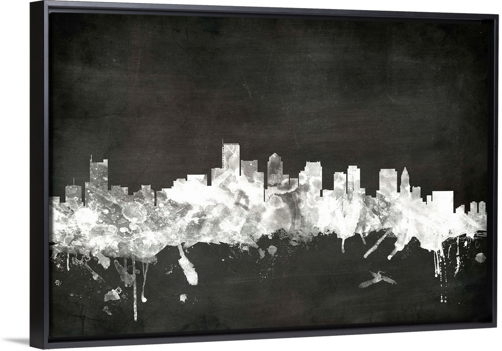 <p>Smokey dark watercolor silhouette of the Boston city skyline against chalkboard background.</p>