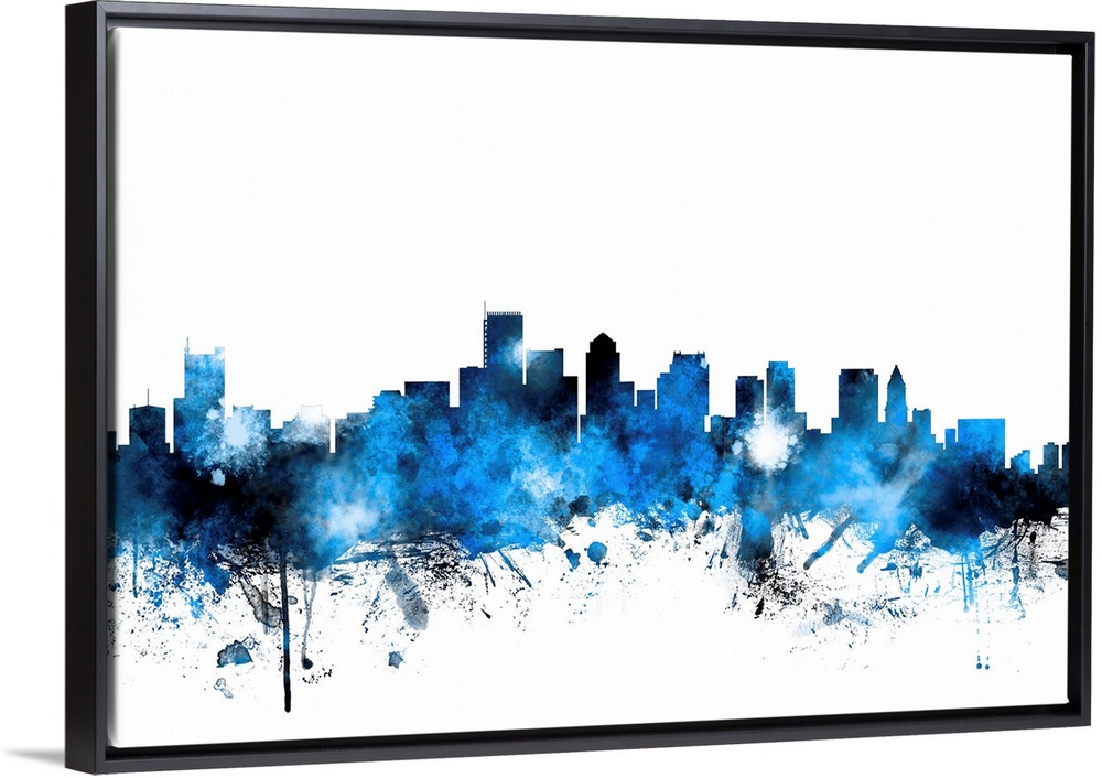 <p>Blue watercolor silhouette of the Boston city skyline.</p>