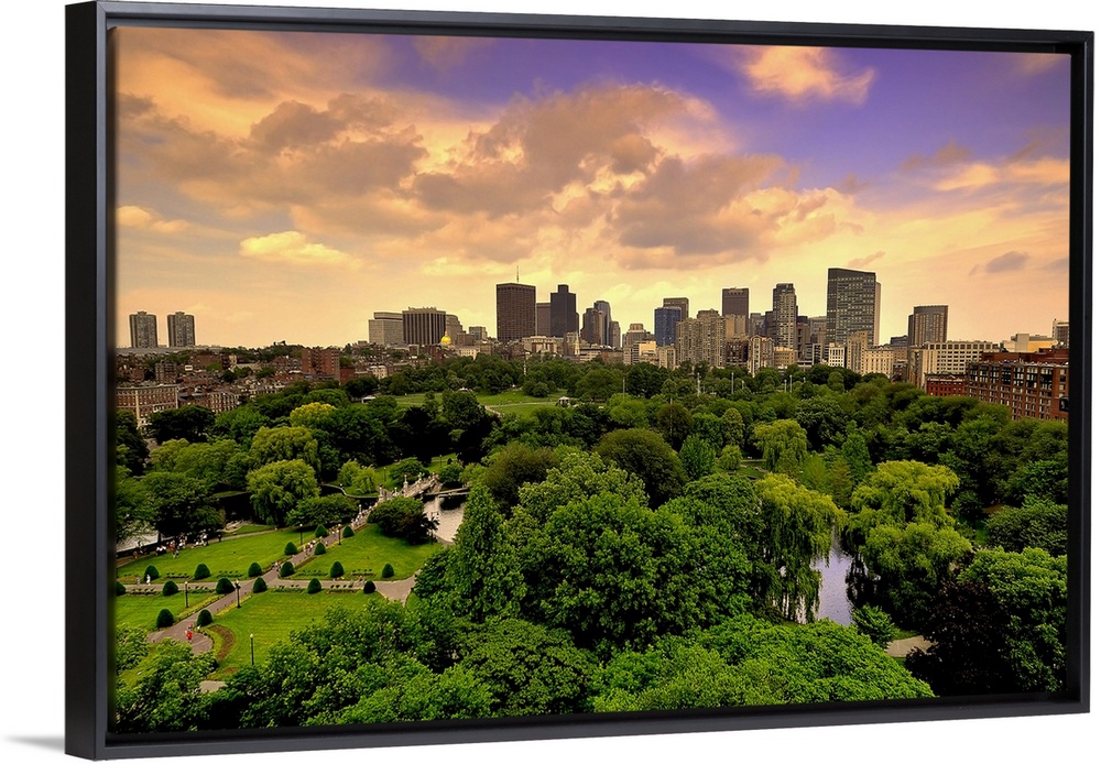 <p>Aerial view of Boston Skyline and Boston Public Garden in early morning, Boston Massachusetts.</p>