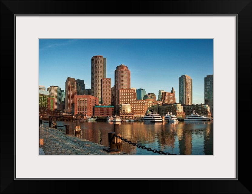 <p>This wall art is a horizontal photograph taken from a harbor dock that shows several skyscrapers and big yachts floating on the water.</p>