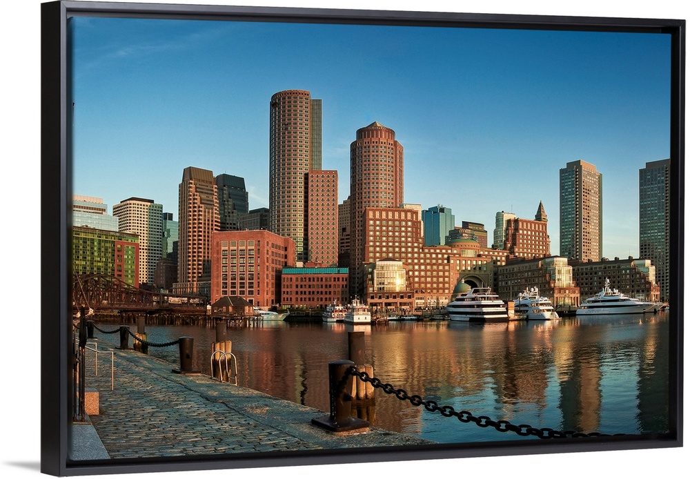<p>This wall art is a horizontal photograph taken from a harbor dock that shows several skyscrapers and big yachts floating on the water.</p>