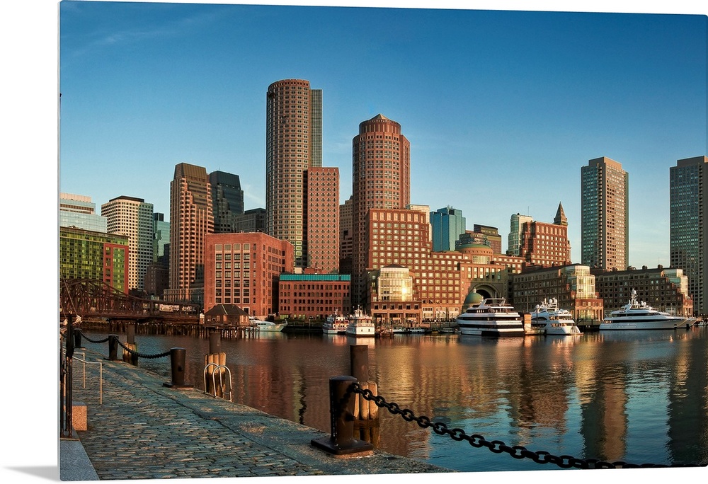 <p>This wall art is a horizontal photograph taken from a harbor dock that shows several skyscrapers and big yachts floating on the water.</p>