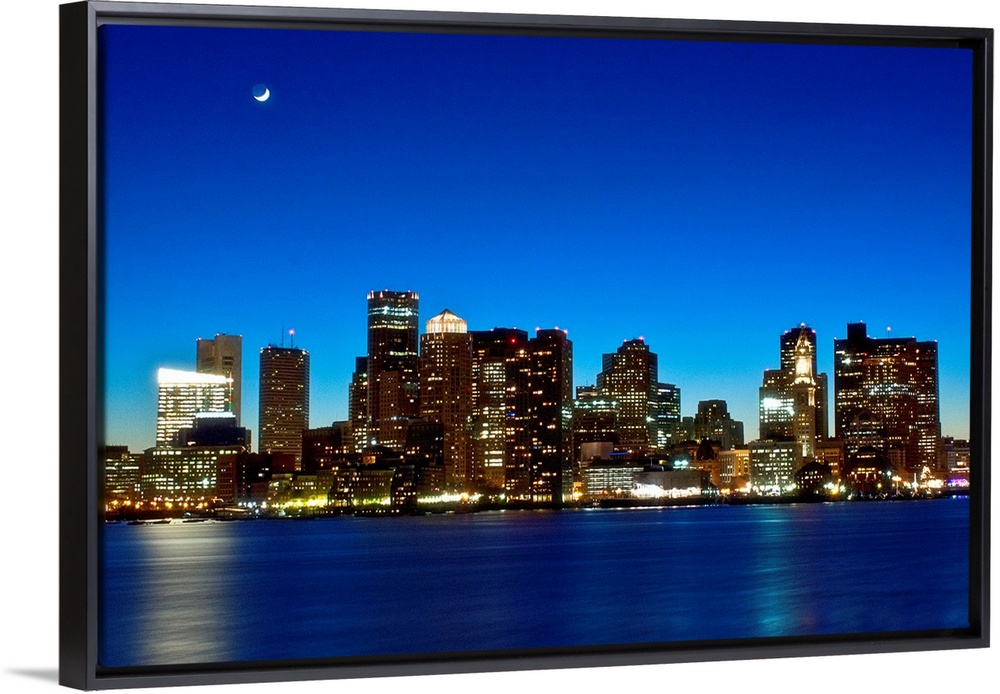 <p>This big photograph is of the Boston skyline under a night sky and crescent moon. Buildings are lit and reflect in the water.</p>
