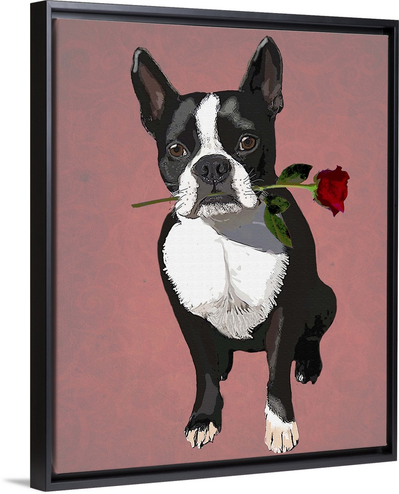 <p>Illustration of a Boston Terrier dog holding a rose in its mouth.</p>