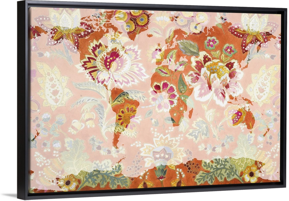<p>A map of the world with a bright orange floral pattern.</p>