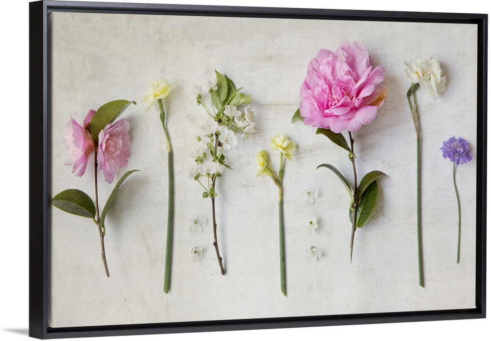 <p>Photograph of different floral plants on a rustic looking background.</p>