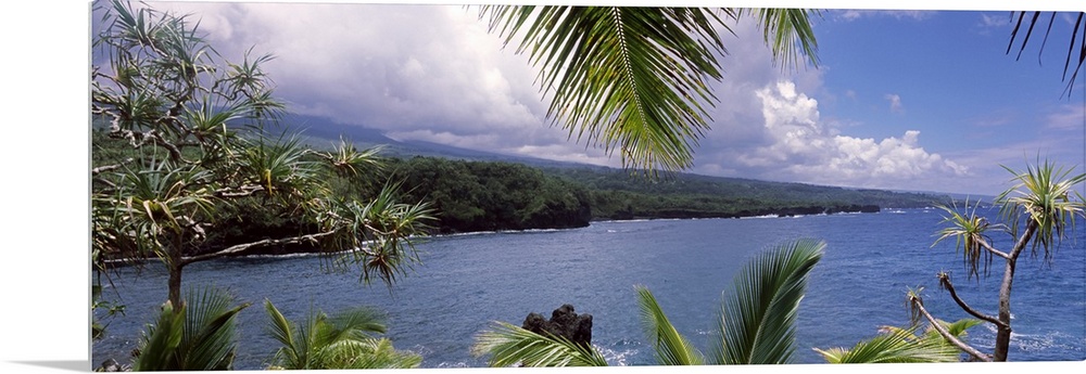 <p>Panoramic photograph of the ocean under a cloudy sky seen from behind the leaves of a lush tropical forest.</p>