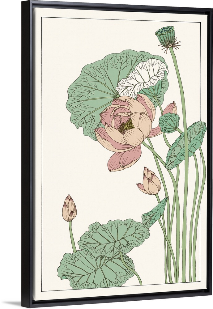 <p>Vintage style illustration of long stemmed lotus blossoms and leaves.</p>