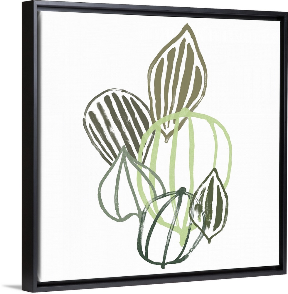 <p>This contemporary artwork features soft painted lines in shades of green that form seedpods over a white background.</p>