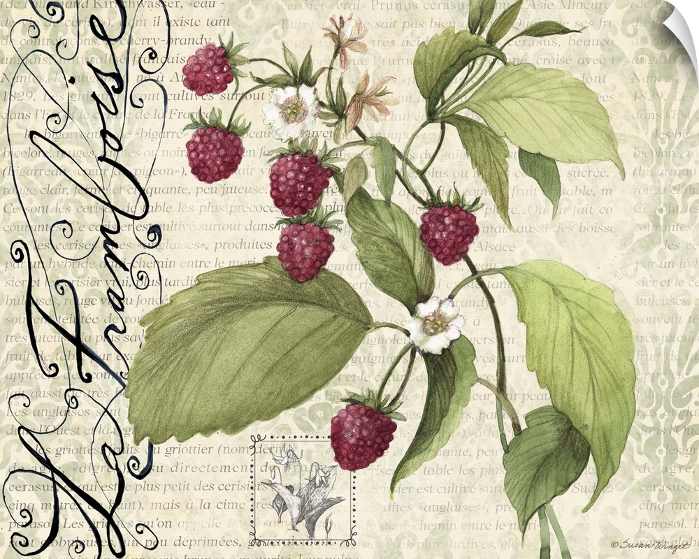 <p>Elegant botanical fruit art with raspberries and leaves with text in the background.</p>