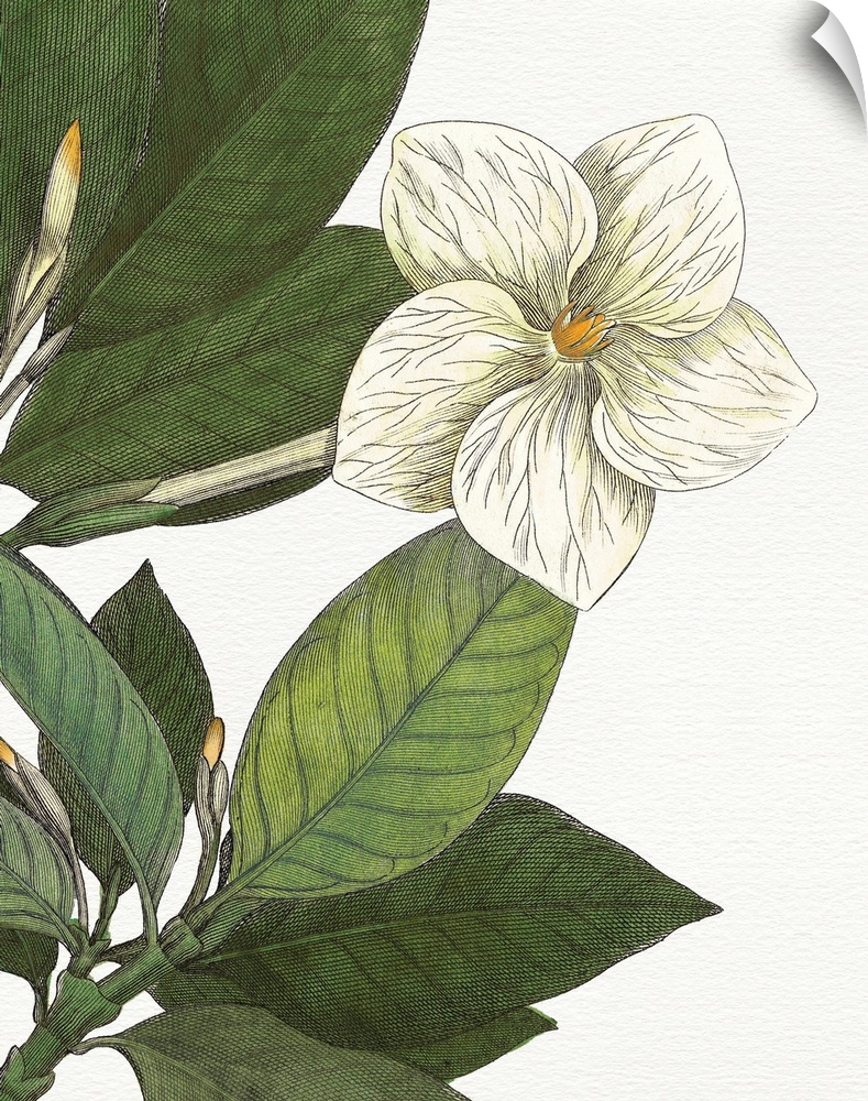 <p>Beautiful botanical illustration of a white gardenia on a white background.</p>