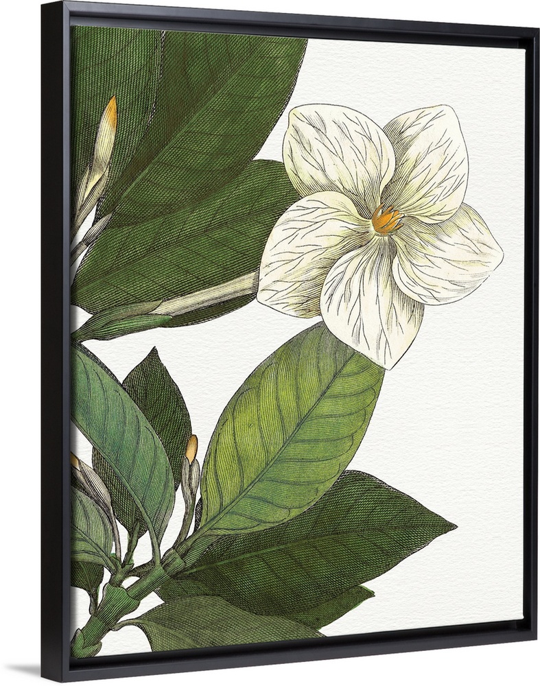 <p>Beautiful botanical illustration of a white gardenia on a white background.</p>