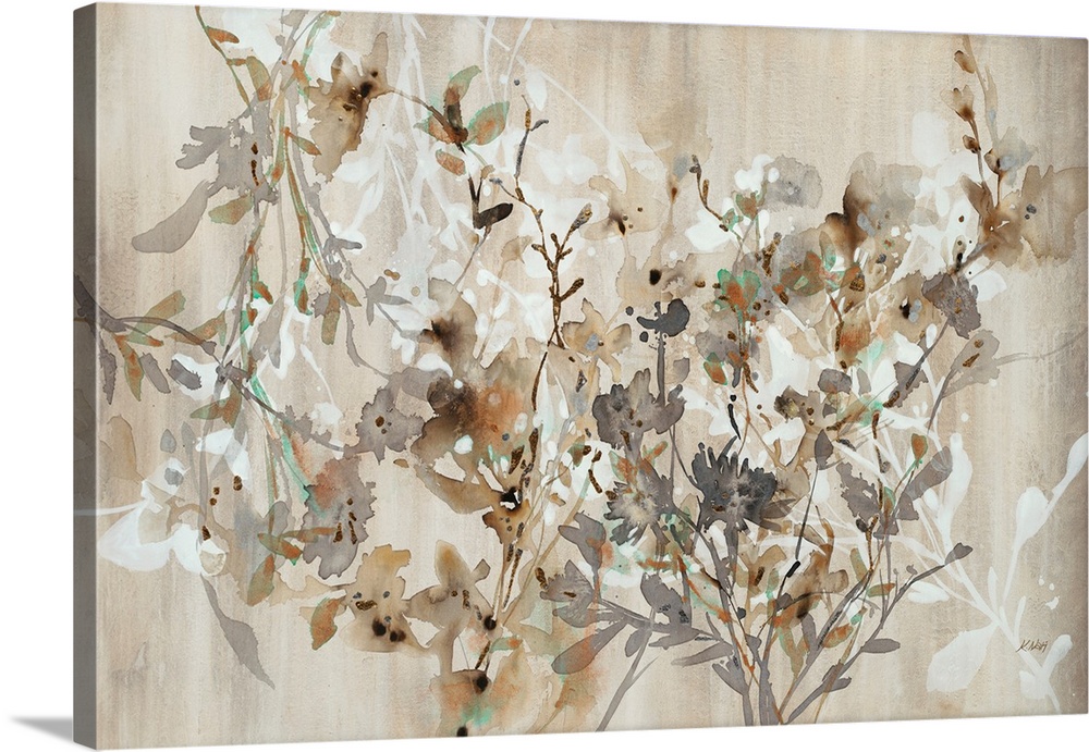 <p>Abstract watercolor botanical art featuring earthy browns, grays, and subtle greens on a warm tan background. Loose brushstrokes create a serene, organic feel with delicate floral and branch forms.</p>