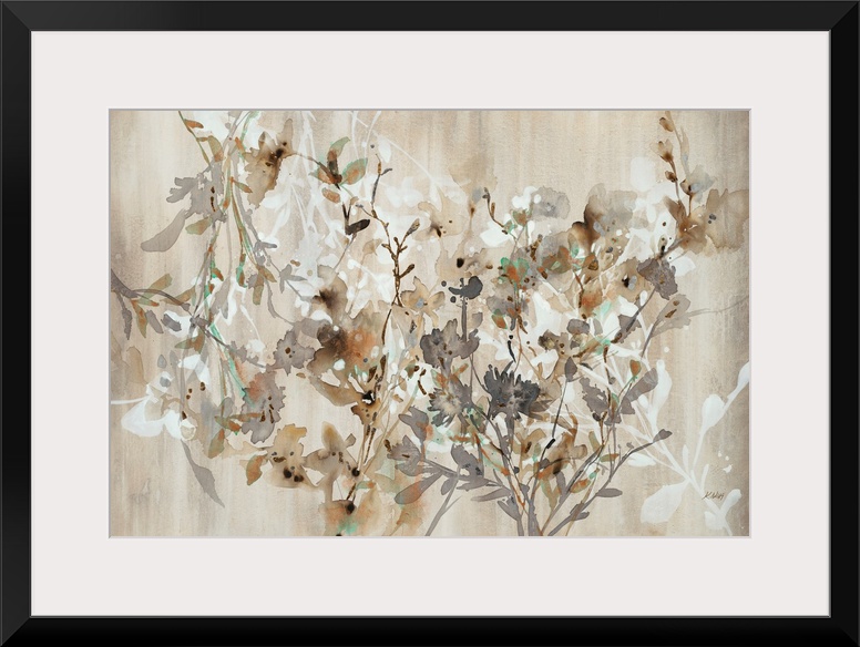 <p>Abstract watercolor botanical art featuring earthy browns, grays, and subtle greens on a warm tan background. Loose brushstrokes create a serene, organic feel with delicate floral and branch forms.</p>