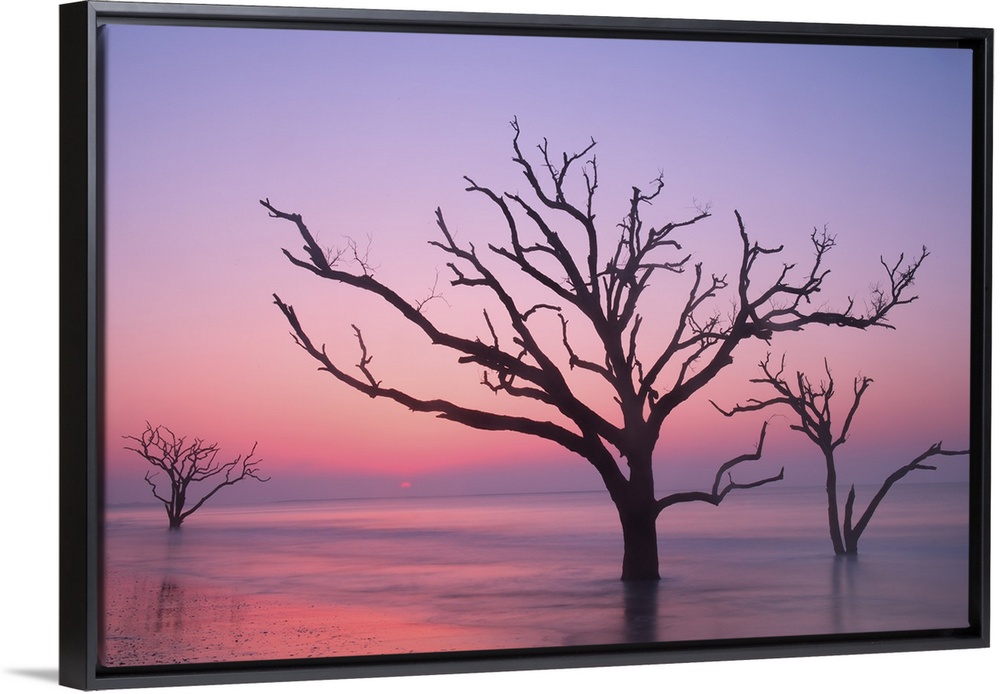 <p>Trees growing in the water off the coast of Botany Bay, South Carolina, under a pink and lavender sunset sky.</p>