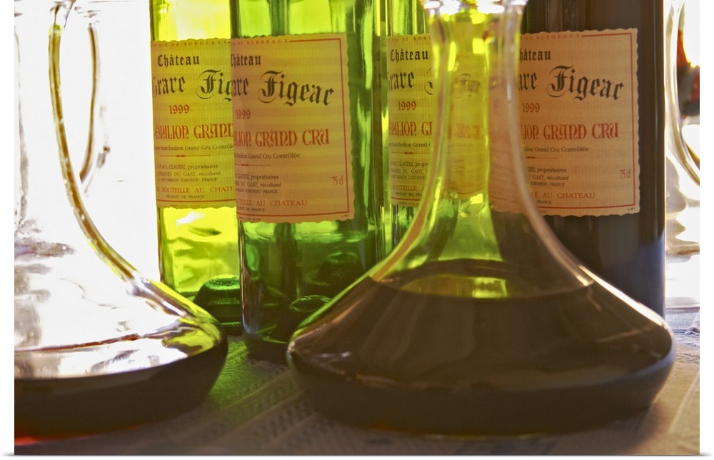 <p>Bottles and carafes decanters with Chateau La Grave Figeac - Chateau La Grave Figeac, Saint Emilion, Bordeaux</p>