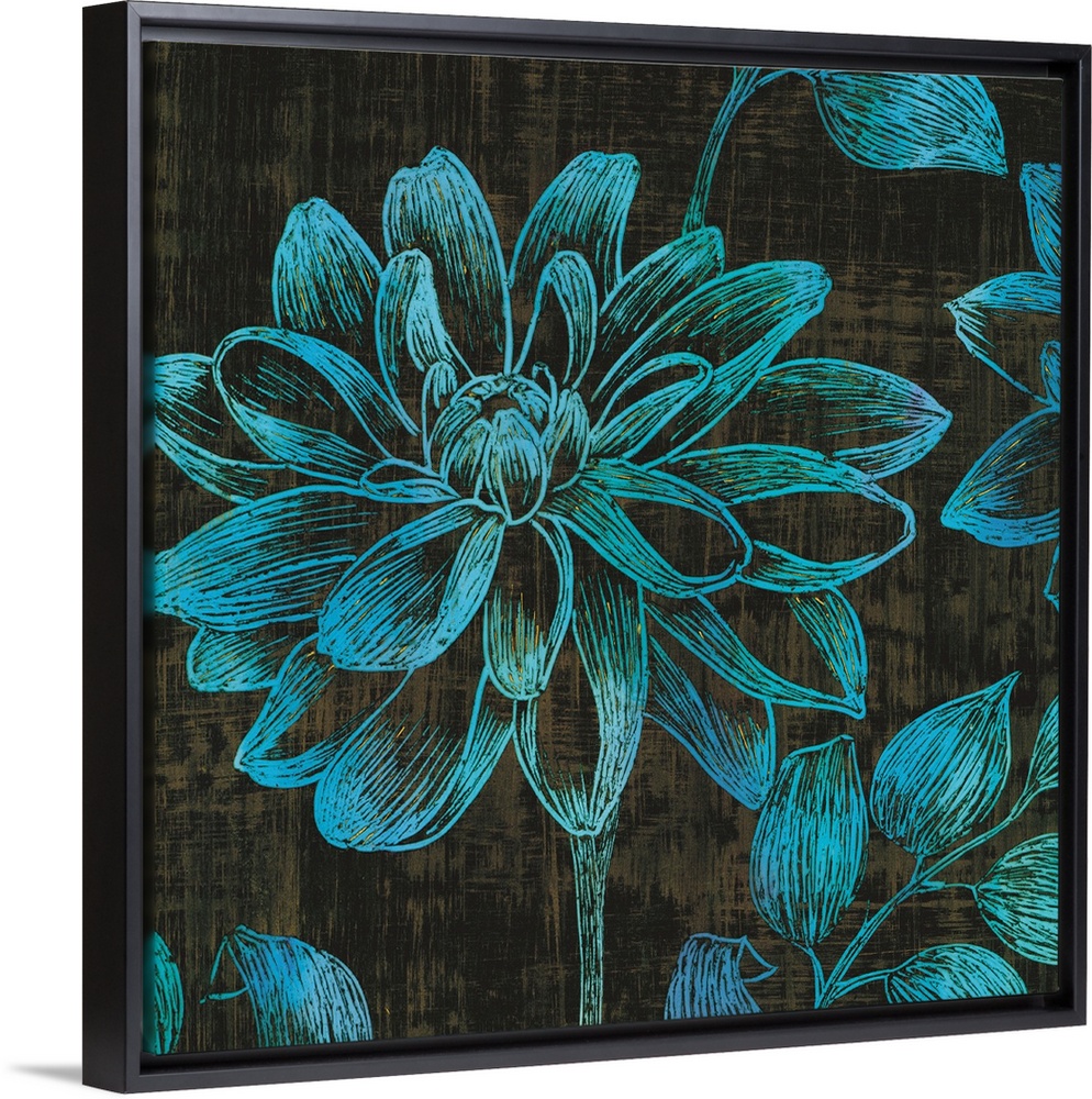 <p>Square contemporary artwork of flowers done in fine lines of teal against of dark backdrop.</p>