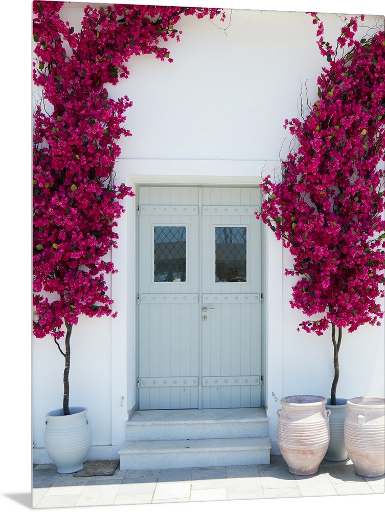 <p>Plastic bougainvillea decoration surrounding a mint coloured door in Naxos city, Naxos, Cyclades, Greek Islands, Greece, Europe</p>