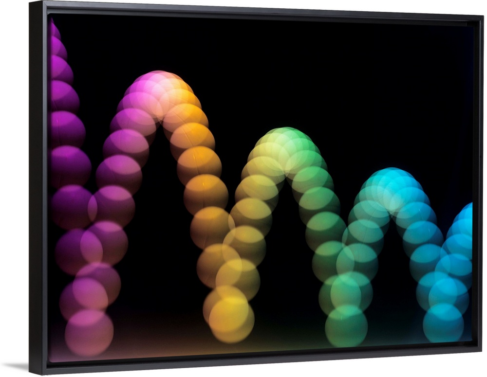 <p>Bouncing ball, stroboscopic image using coloured lights. The strobe light was set to flash 50 times every second, and the exposure time was about 1.5 seconds, so about 75 separate images were obtained on this single exposure. The sequence of images shows that the ball's trajectory is a parabola, as predicted by theory. The sequence also shows the changing speed of the ball: the ball moves fastest near the ground and slowest at the top of an arc. The sequence also shows that the horizontal speed is approximately constant, and only the vertical speed is changing (due to gravity). The height of successive bounces is less as the ball loses energy by hitting the ground.</p>