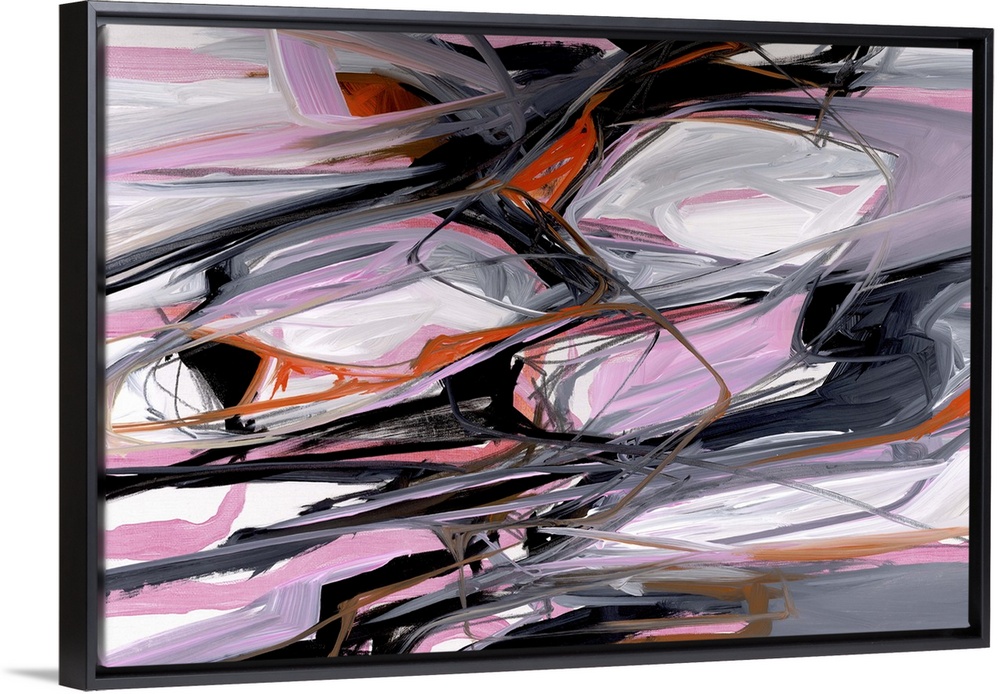 <p>Contemporary abstract painting in contrasting shades of pink, orange, and black.</p>