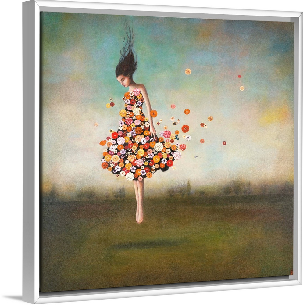 <p>Contemporary surreal artwork of a woman wearing a dress made of flowers floating in the air.</p>